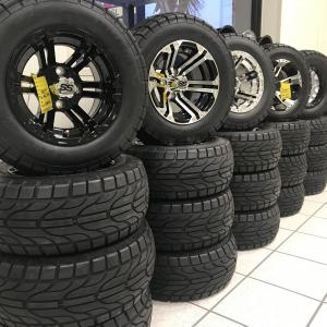 We offer aluminum wheels 10"-14", performance street tires and rugged off-road styles in low profile and lift kit sizes. Tire and wheel accessories. Standard tires and 8" wheels and a selection of wheels covers. Fairway Alloy brand cast aluminum wheels and tires are top of the line and made to outlast all other brands. We have been selling Fairway Alloy wheels for over 12 years and they look just as new as the day they were installed. Stop by our showrooms to see what we have in stock or order the size and color to fit your needs.